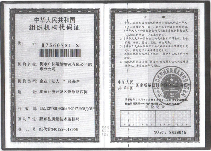 衡水广怀运输物流有限公司肥东分公司组织机构代码证